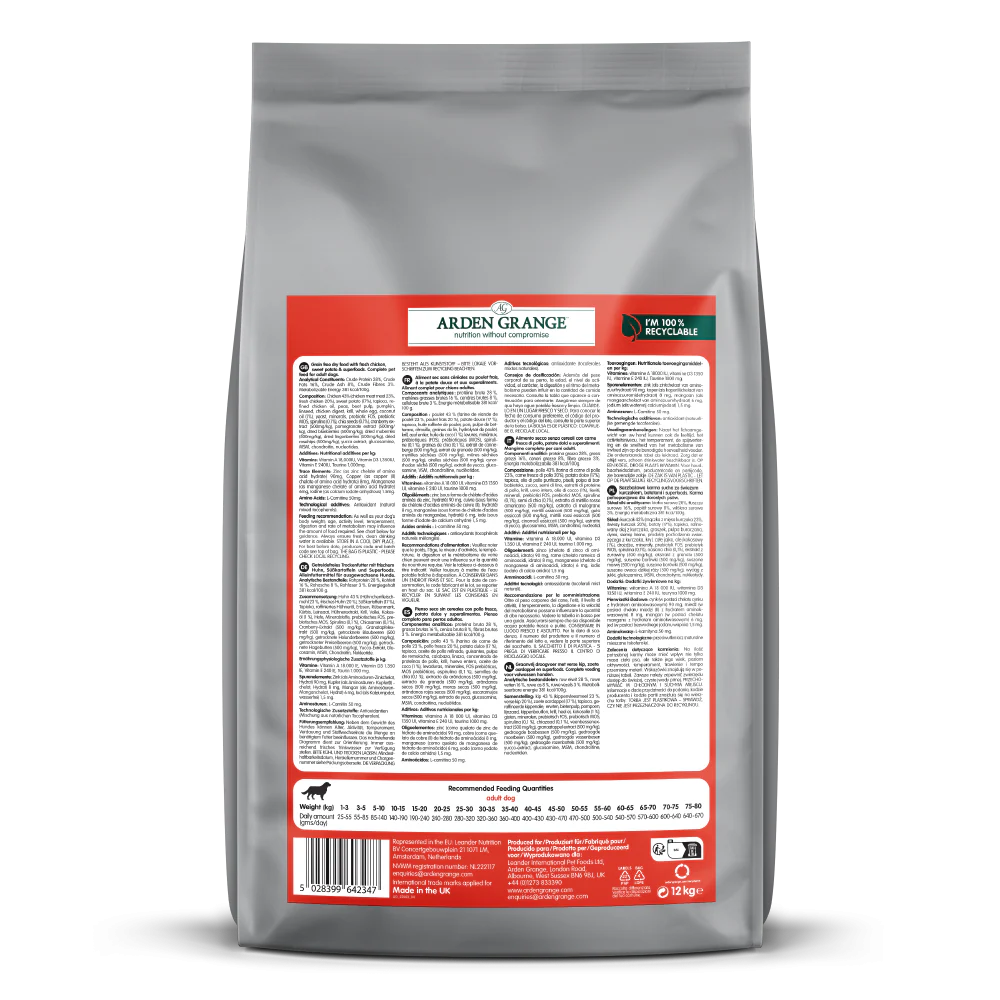 Arden Grange Grain Free adult chicken & superfoods is a complete, super premium pet food for normally active adult dogs. It contains a high proportion of fresh chicken which is a delicious and highly digestible protein source. This recipe excludes grains and cereals and contains a novel carbohydrate source for dogs who cannot tolerate white potato or rice. This diet also includes our blend of nutrient-rich superfood ingredients.